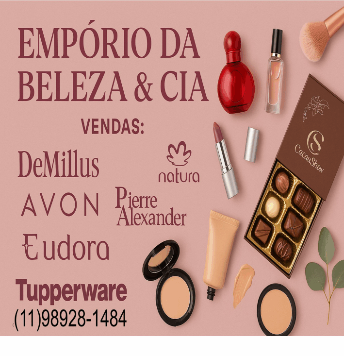 Oferecemos cosméticos, brigadeiros gourmet e roupas íntimas, organizados para facilitar sua escolha.